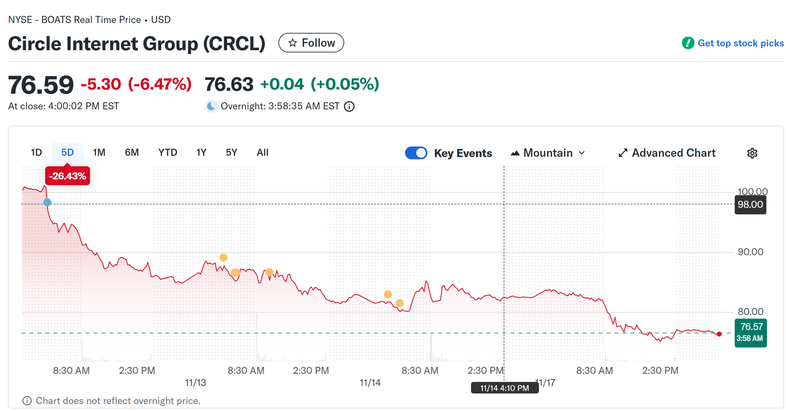Stablecoin issuer Circle (CRCL), which went public earlier this year, also ended the day down by more than 6%. The company is down more than 26% over the past five trading days.