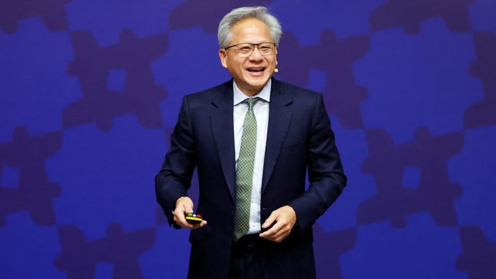 Jensen Huang, CEO of Nvidia, reacts during the 2025 Asia-Pacific Economic Cooperation (APEC) CEO Summit in Gyeongju, South Korea, October 31, 2025.