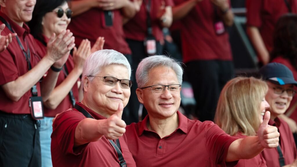 C. C. Wei, chief executive officer of Taiwan Semiconductor Manufacturing Co. (TSMC), left, and Jensen Huang, chief executive officer of Nvidia Corp., during the TSMC sports day event in Hsinchu, Taiwan, on Saturday, Nov. 8, 2025.