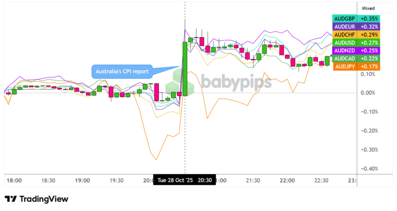 The Australian dollar, which was moving sideways ahead of the CPI report, strengthened across the board following the release, with gains ranging from 0.17% to 0.35% against major currencies.