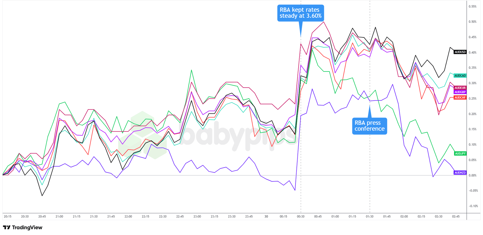 Overlay of AUD vs. Major Currencies Chart by TradingView