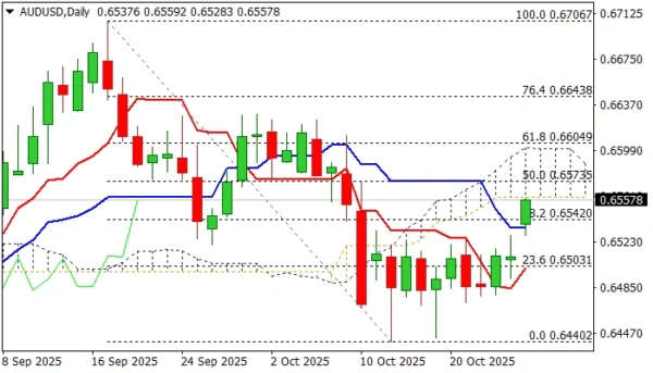 Bullish scenario requires penetration of daily cloud and rise above nearby 0.6573 Fibo barrier (50% retracement of 0.6706/0.6440) to strengthen near-term structure and open way for attack at next key barriers at 0.6600 zone (cloud top / Fibo 61.8%).