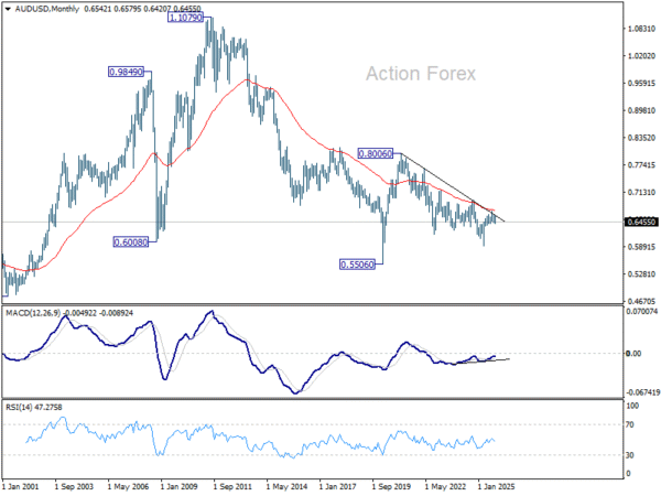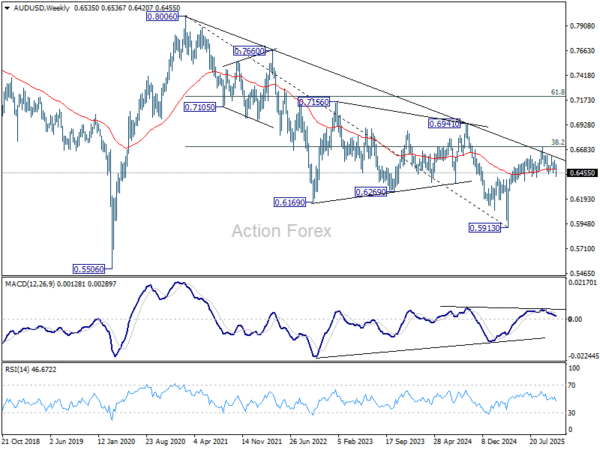 In the bigger picture, there is no clear sign that down trend from 0.8006 (2021 high) has completed. Rebound from 0.5913 is seen as a corrective move. Outlook will remain bearish as long as 38.2% retracement of 0.8006 to 0.5913 at 0.6713 holds. Break of 0.6413 support will suggest rejection by 0.6713 and solidify this bearish case. Nevertheless, considering bullish convergence condition in W MACD, sustained break of 0.6713 will be a strong sign of bullish trend reversal, and pave the way to 0.6941 structural resistance for confirmation.