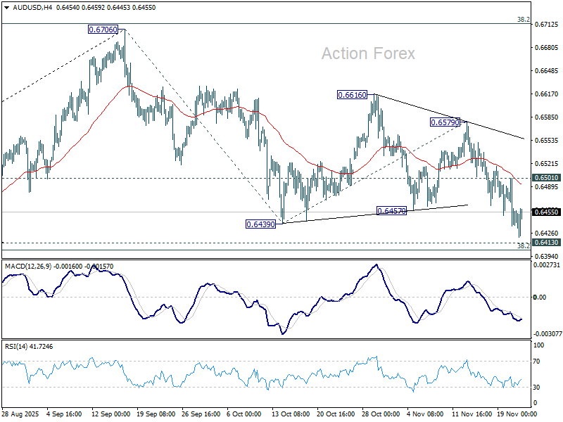 AUD/USD’s fall from 0.6706 resumed by breaking through 0.6439 support last week. Initial bias stays on the downside for 0.6413 cluster (38.2% retracement of 0.5913 to 0.6706 at 0.6403). Decisive break there should confirm near term bearish reversal. Next target is 100% projection of 0.6706 to 0.6439 from 0.6579 at 0.6312. ON the upside, though, above 0.6501 minor resistance will turn intraday bias neutral first.