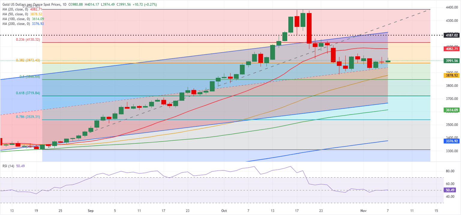 Gold (XAU/USD) struggled to make a decisive move in either direction and spent the week fluctuating within a relatively tight channel at around $4,000. With geopolitics moving to the backseat and the ongoing government shutdown causing postponement of economic data releases in the United States (US), investors will scrutinize comments from Federal Reserve (Fed) policymakers to assess the odds of another interest rate cut in December.