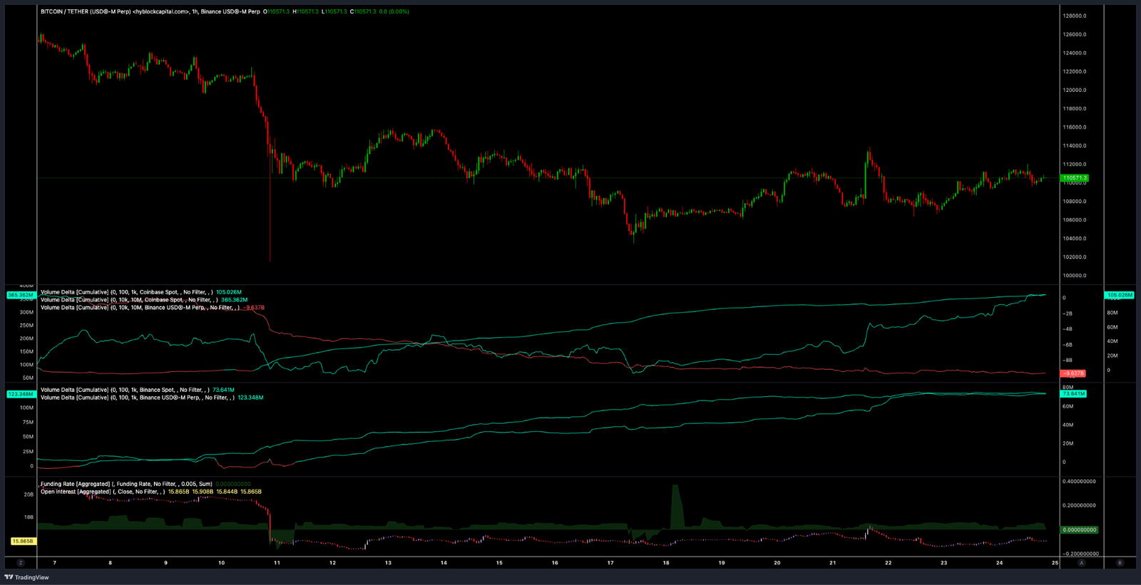 Alongside these inflows, data shows spot buyers across order-size cohorts at Binance and Coinbase exchange stepping in to buy throughout the entire range from $101,500 (Binance) to the range high of this week (114,000).