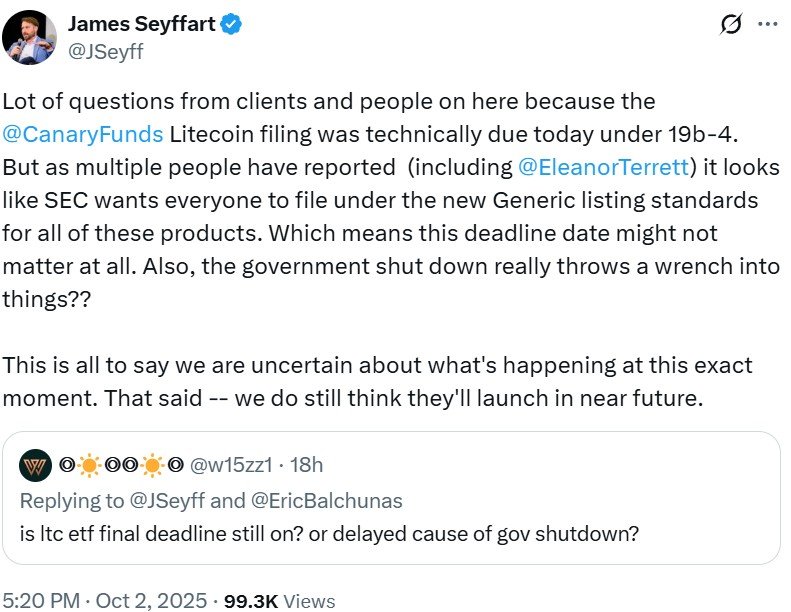 The government shutdown is expected to slow the Securities and Exchange Commission’s review of routine applications, including crypto exchange-traded funds (ETFs). Proposals tied to Litecoin (LTC), Solana (SOL) and XRP (XRP) face decision deadlines throughout the month, but are now likely to be delayed until the agency returns to normal operations.