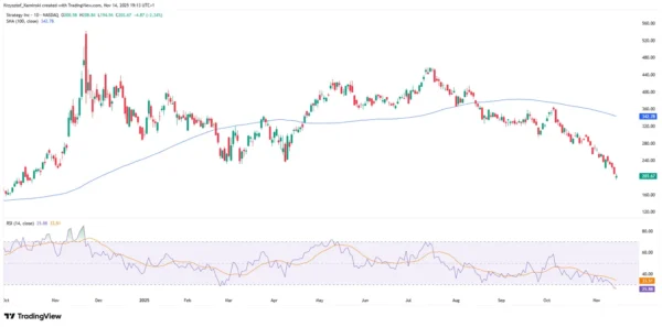 Strategy Inc., one of the largest corporate holders of Bitcoin, has also come under pressure. Its stock around 2%, raising concerns that its market value could dip below the value of its BTC holdings (approximately $61 billion). The company’s total enterprise value, including debt and preferred equity, currently stands at $74.8 billion.