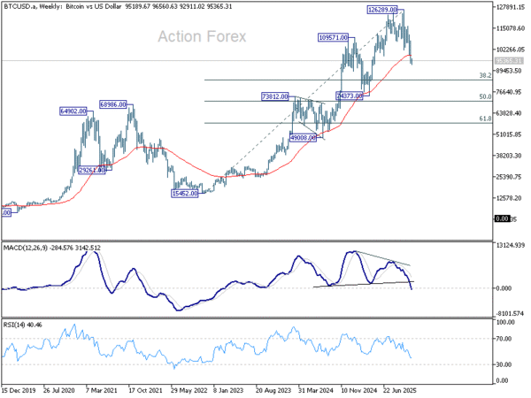 The longer-term chart carries deeper implications. The entire uptrend from 15,452 (2022 low) may have completed as a five-wave rise to 126,289. Bearish divergence in W MACD supports this interpretation, and last week’s break below 55 W EMA (now at 98,483) reinforces the prospect of a broader correction.