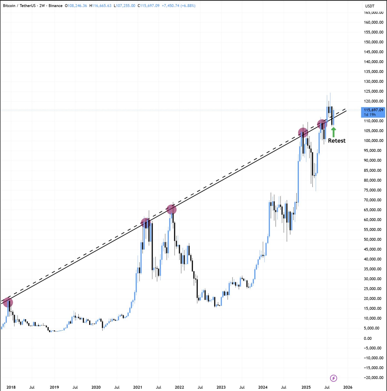 “$BTC has reclaimed its 8-yr trendline level. It has a breakout in July, and last month BTC lost this key level. But now, bulls have closed a strong candle,” he explained alongside an accompanying chart.
