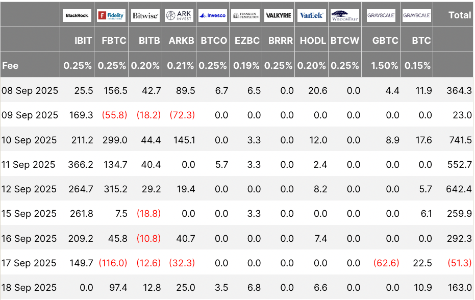 When the BTC/USD increased by 10% to almost $118,000 between Sept. 2 and Sept. 18, net inflows topped $2.9 billion over eight trading days, per data from Farside Investors. This included the largest daily net inflow in two months of over $741.1 million.