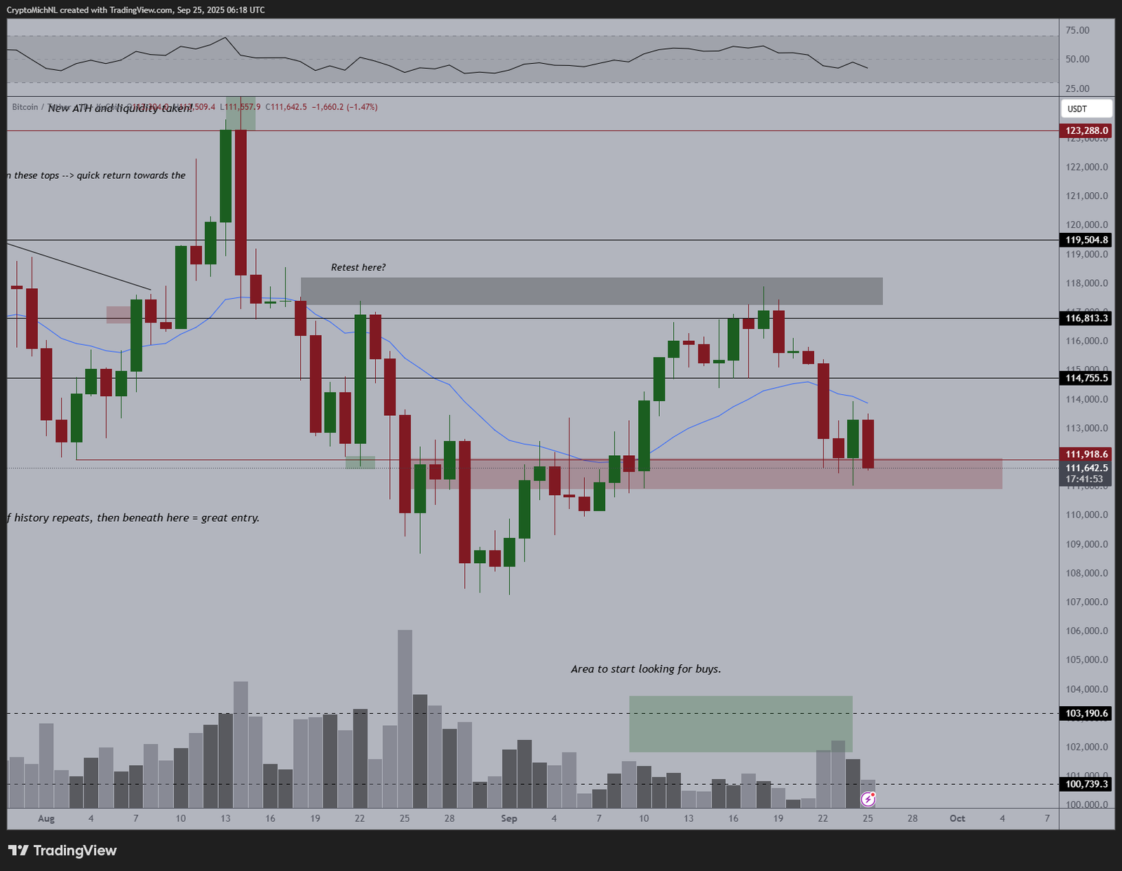 An accompanying chart showed that if Bitcoin loses the $112,000-$110,000 support zone, it could drop toward the $103,000-$100,000 demand zone, a good “area to start looking for buys.”