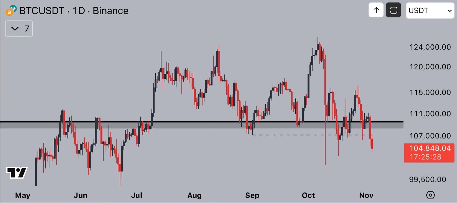 Bitcoin trader AlphaBTC stated that a daily candlestick close below yesterday’s low, around $105,300, could trigger a fresh downward leg below the $100,000 psychological level.