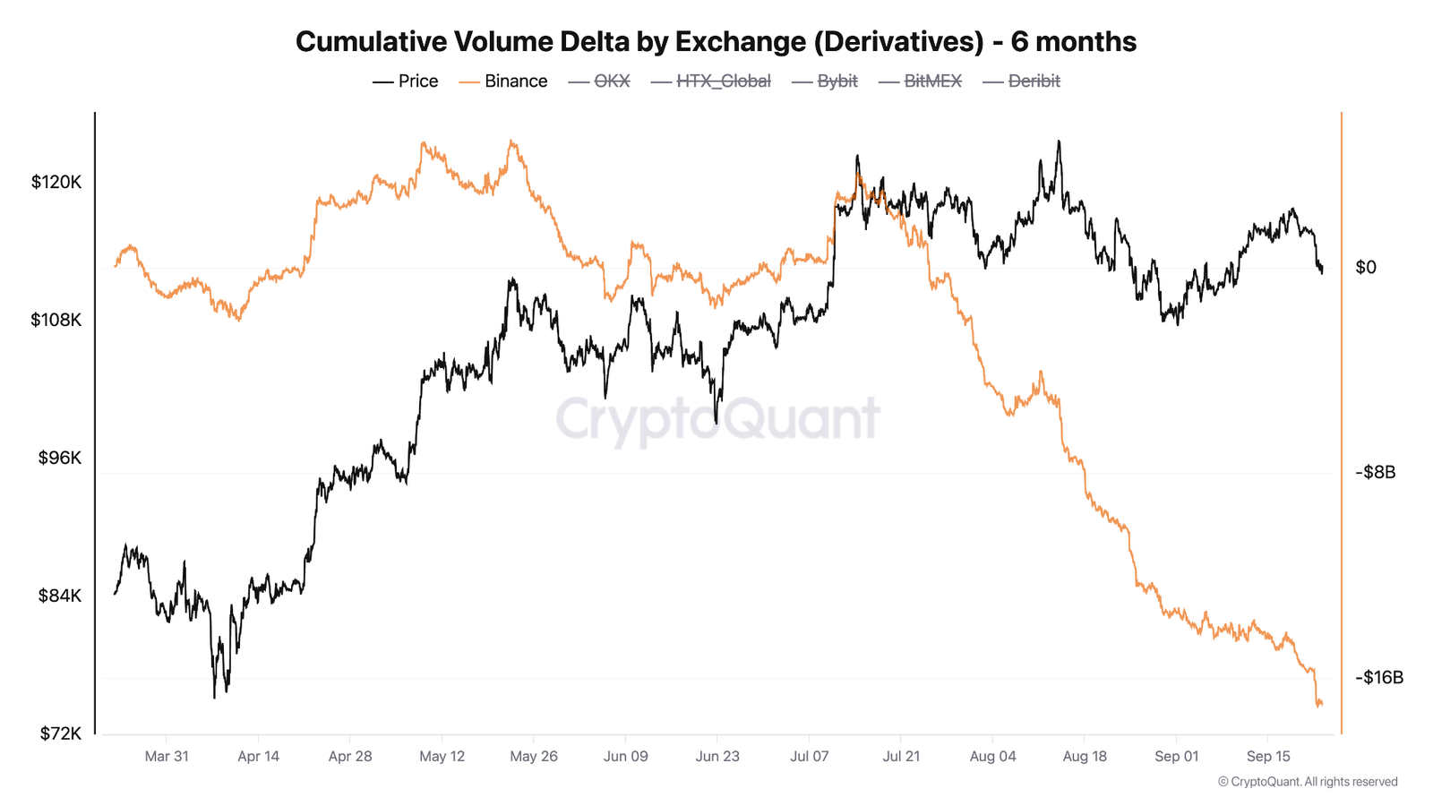 Despite sustained sell-side aggression on Binance derivatives since mid-July, Bitcoin has mostly held its ground within a tight $110,000–$120,000 range. Cumulative Volume Delta (CVD) data remains negative, signaling consistent short-selling pressure from takers.