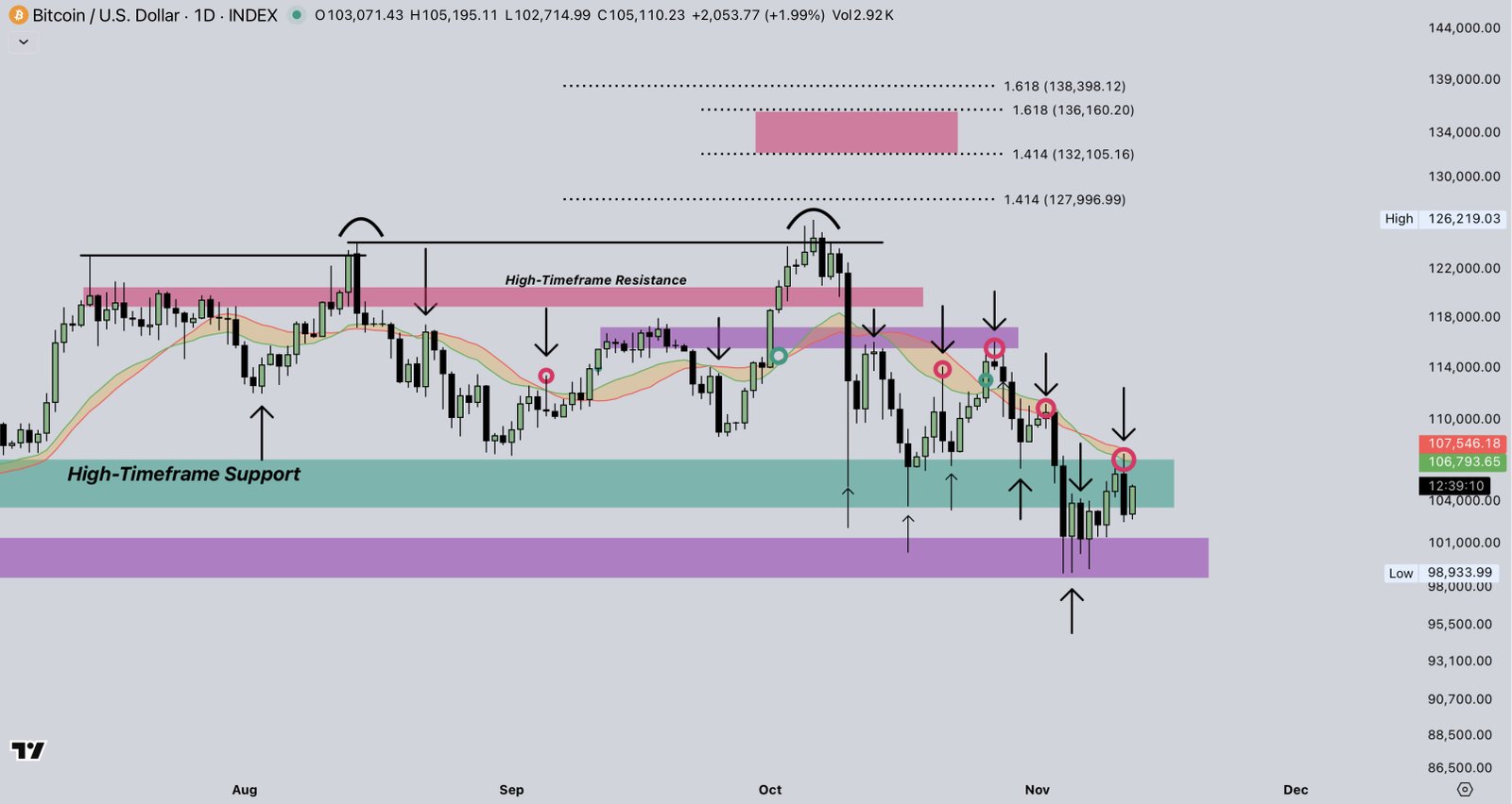 “If the price breaks below the purple support range, I’d look to hedge part of my spot holdings to mitigate short-term downside risk, as that would likely open the door for a deeper pullback on the low-timeframes,” he told X followers alongside an explanatory chart.