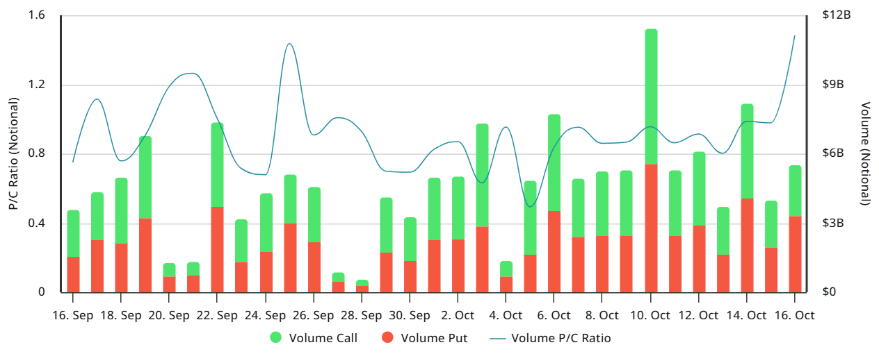 Demand for downside protection strategies on Deribit surged on Thursday as trading volumes for put options exceeded call options by 50%, a sign of mounting market stress. The indicator climbed to its highest level in over 30 days. Cryptocurrency traders are typically optimistic, so a neutral reading for the put-to-call ratio tends to sit around -20%, favoring call options.