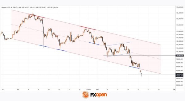 Bulls may hope that the drop beneath the psychological $90k level will spark a rebound (similar to the price action after the dip below $100k in early November, which resulted in a period of consolidation shaped like a Bull Flag).