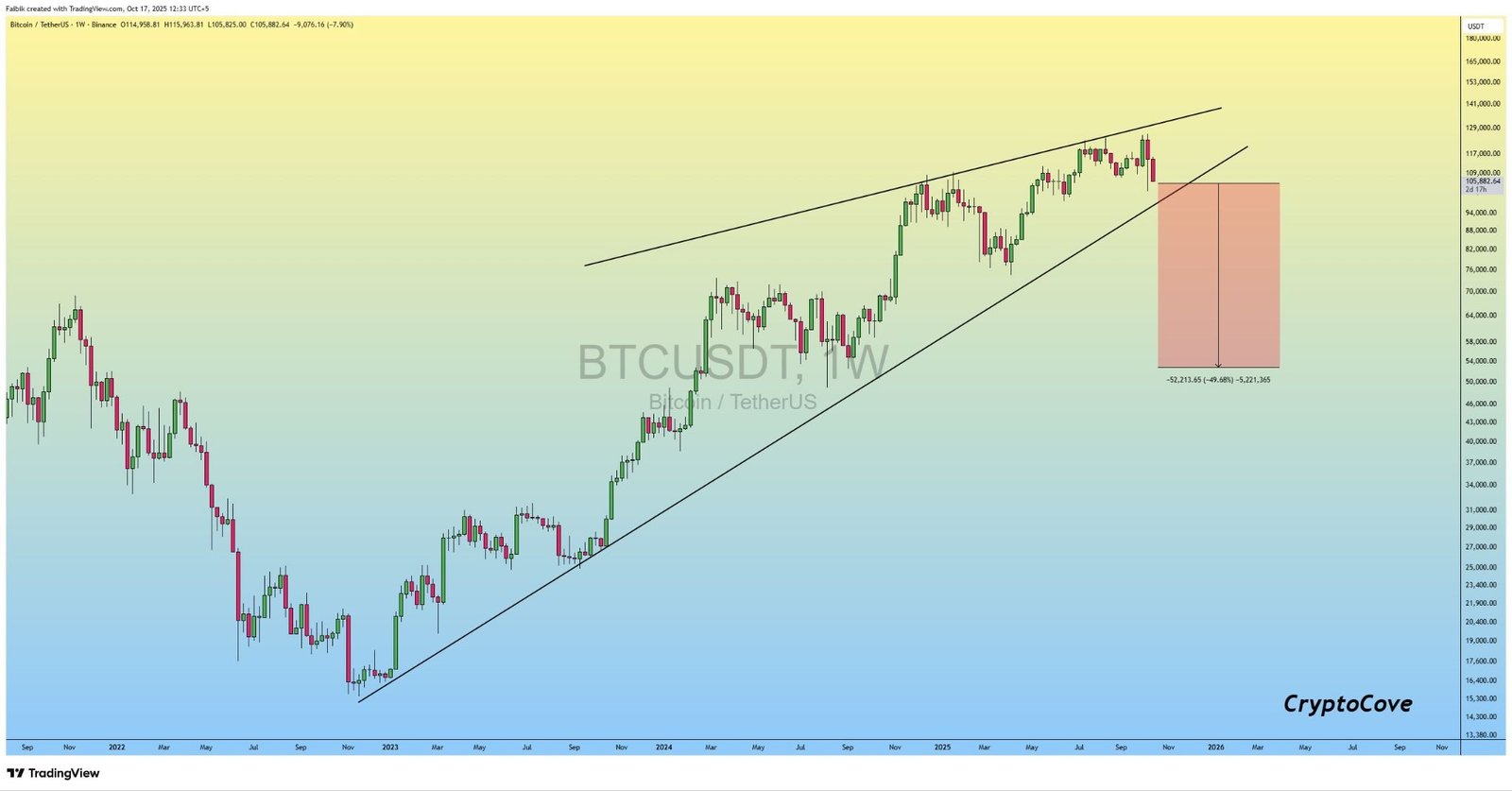 Fellow analyst Captain Faibik highlighted that Bitcoin appears to be following a rising wedge pattern on the weekly chart, with a measured target of $52,200.