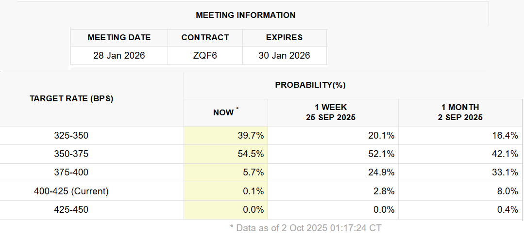 According to the CME FedWatch tool, the implied probability of the US Federal Reserve lowering rates to 3.50% or below by January 2024 now stands at 40%, compared with 18% in mid-August. Investors may welcome inflation’s current trajectory, but ongoing labor market weakness could challenge the recent S&P 500 all-time high, particularly amid uncertainty tied to the US government shutdown.