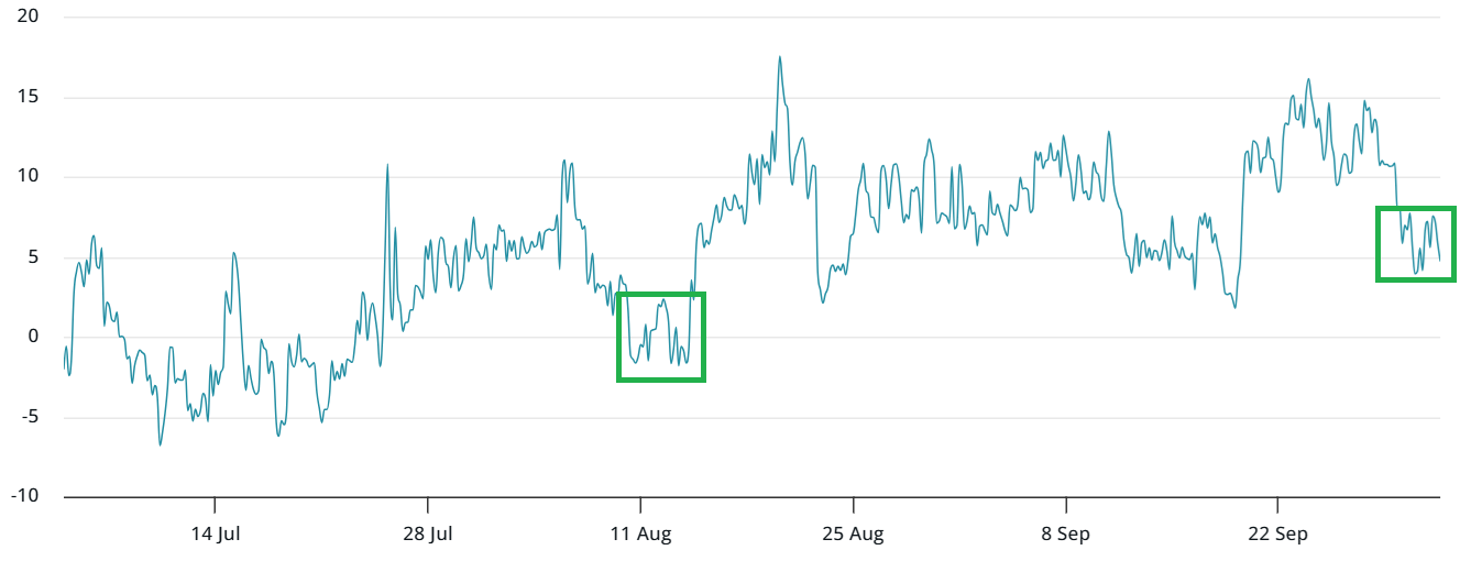 In the three days leading to Bitcoin’s all-time high in mid-August, traders were pricing roughly equal odds of upward and downward price moves, according to derivatives data. Today, however, the same BTC options indicator signals a moderate fear of correction, with put (sell) options trading at a premium compared with call (buy) options.