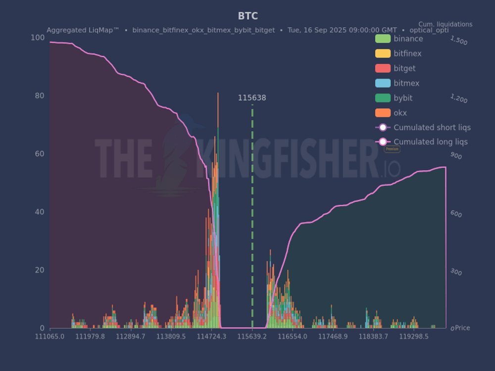 “There’s a huge cluster of long liquidations below the current price, specifically around the 114724.3 level. That’s a lot of trapped longs,” trading resource TheKingfisher observed in part of its latest commentary on X.