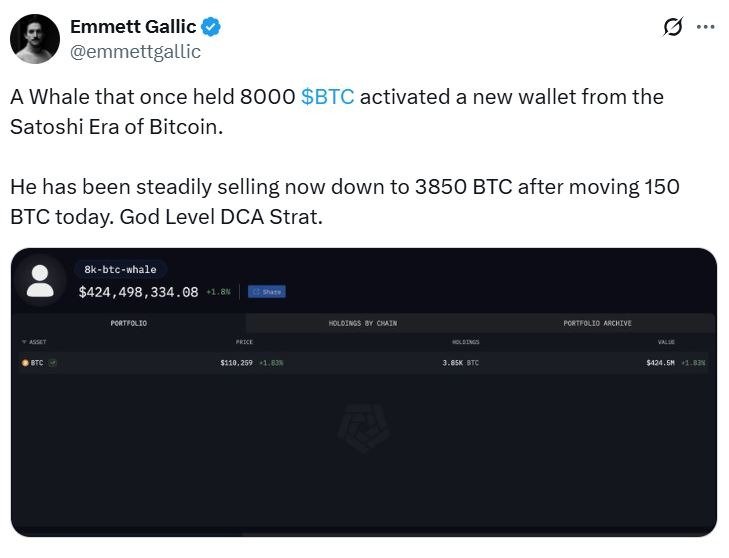 Another X user, Emmett Gallic, a self-employed blockchain analyst, said the whale once held 8,000 Bitcoin across multiple wallets and has been steadily selling off its holdings in another address “for years.”