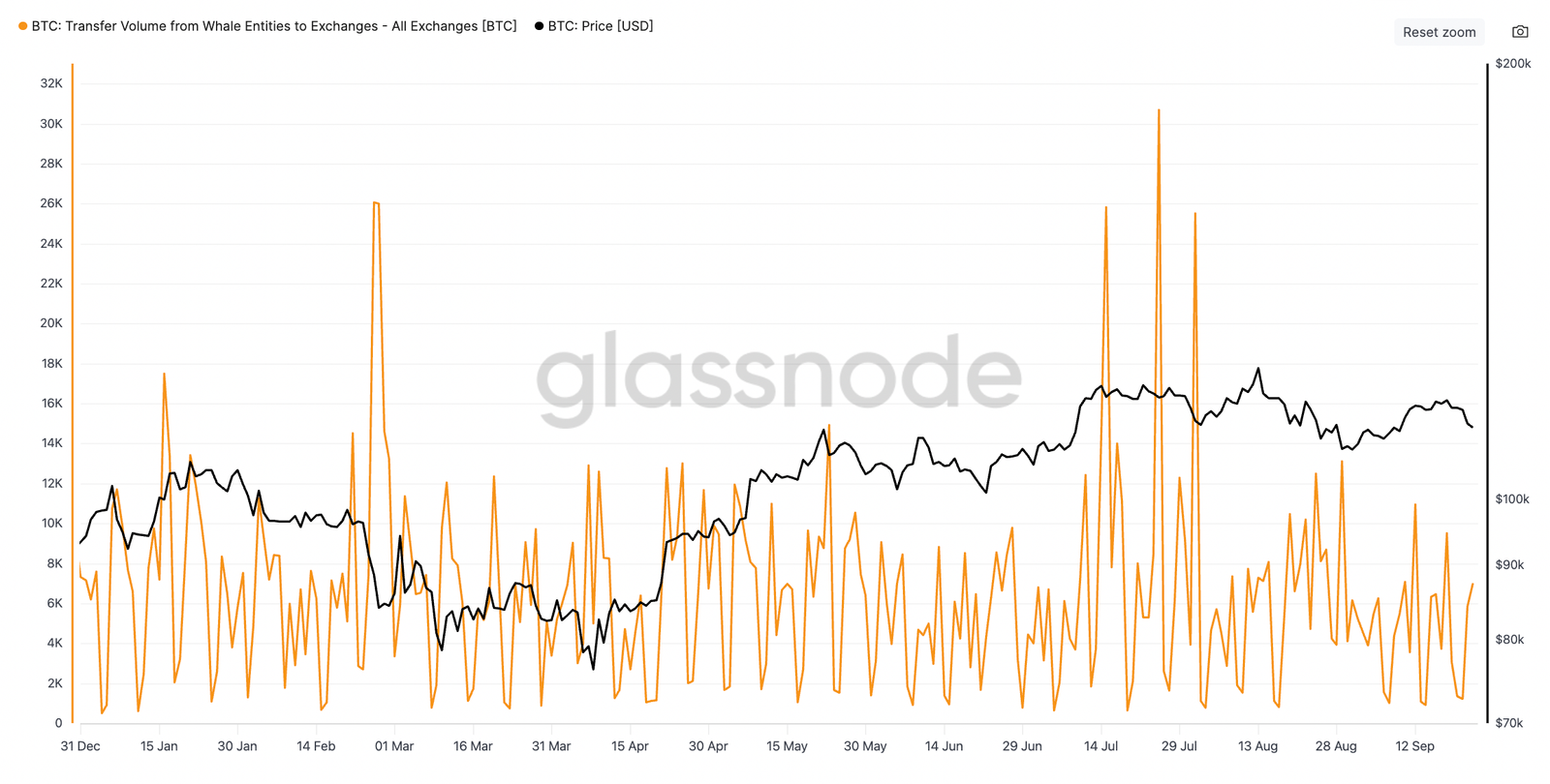 Data from Glassnode showed that while whale moves may be accelerating, the volume transferred by these entities to exchanges has been relatively low since late August, which means that coins are likely going elsewhere.