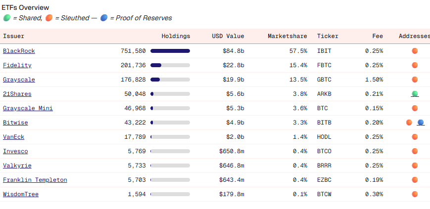 Bitcoin ETFs by market share. Source: Dune.com