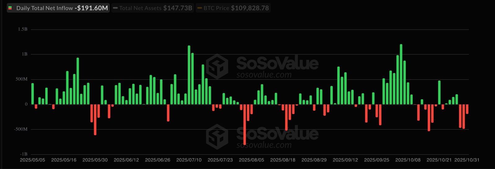 On Oct. 31, spot Bitcoin ETFs saw a total daily net outflow of $191 million, with none of the 12 ETFs recording inflows.