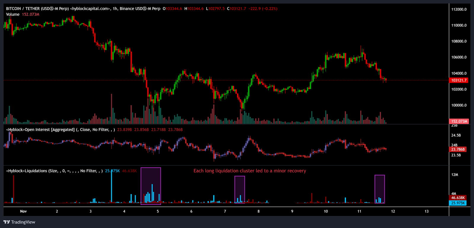 However, onchain liquidation patterns might be signaling a bullish reversal. Data from Hyblock Capital pointed out that clusters of long liquidations observed on Nov. 4 and Nov. 7, both near $100,000, preceded minor recoveries, suggesting localized mean reversion.