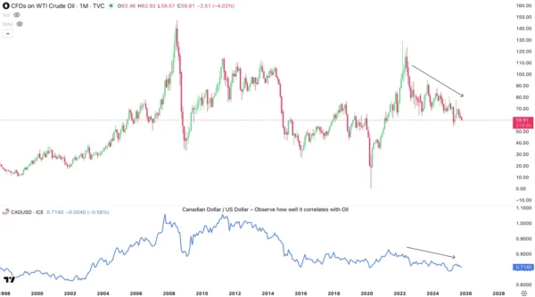 WTI Oil and CAD/USD since 1998, Source: TradingView