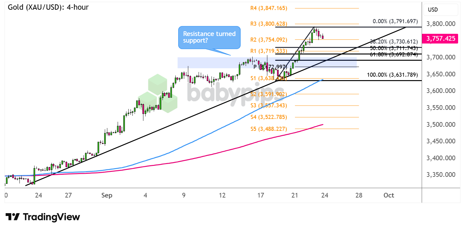 The precious metal is hovering above R2 ($3,754.09) but could still dip to the 38.2% Fib closer to R1 ($3,719.53) that could serve as the first line of defense among gold bugs.