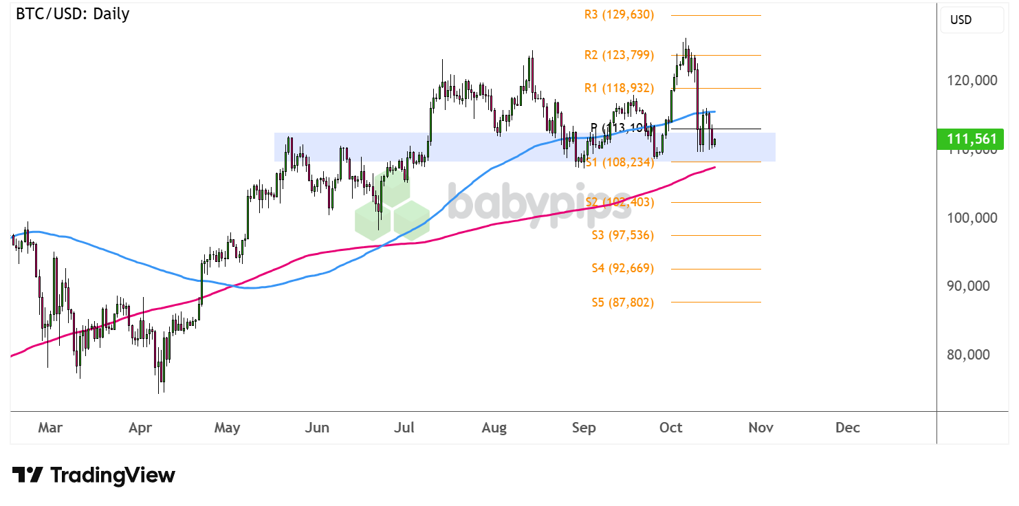 Price is hovering just above S1 ($108,234) which happens to line up with a former ceiling that held around the middle of the year. Support seems to be holding so far, but it’s also worth noting that this area could serve as the neckline of a reversal chart pattern.