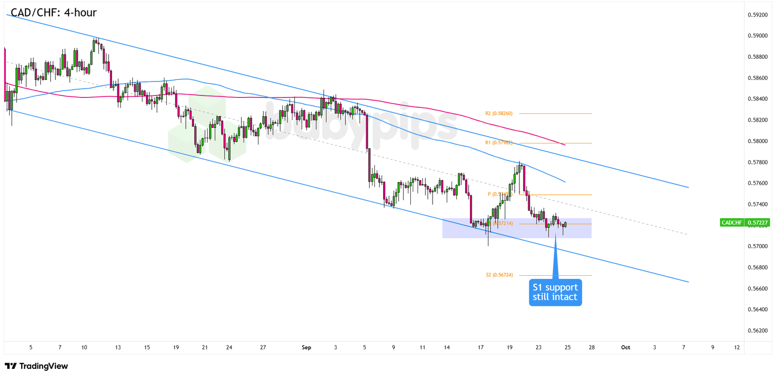 The .5720 area is doing some heavy lifting here, lining up with the S1 Pivot Point and the bottom of a descending channel on the 4-hour chart.