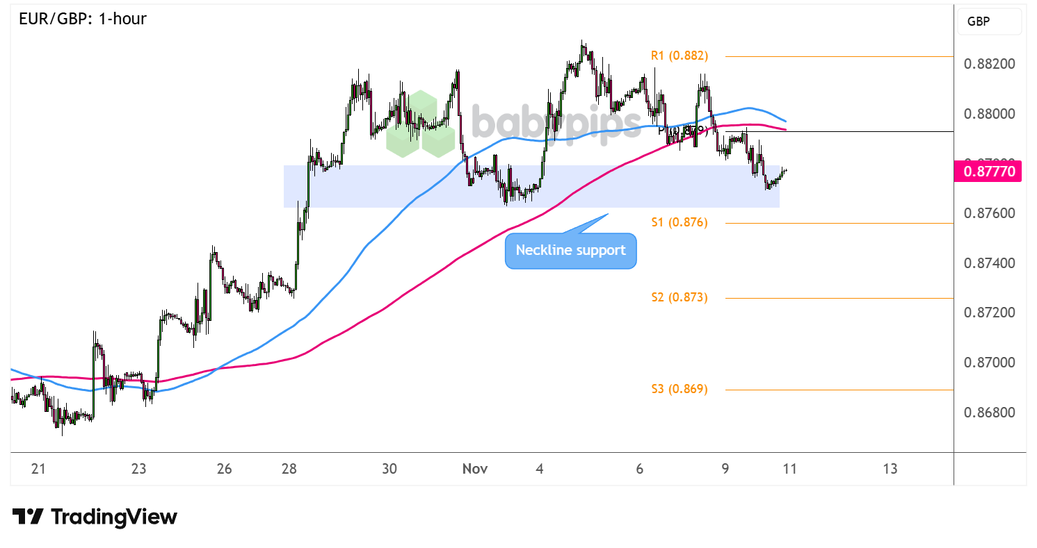 EUR/GBP has made a couple of failed attempts to bust through the .8820 resistance zone, finding support around the .8775 mark to create a double top on its hourly chart.