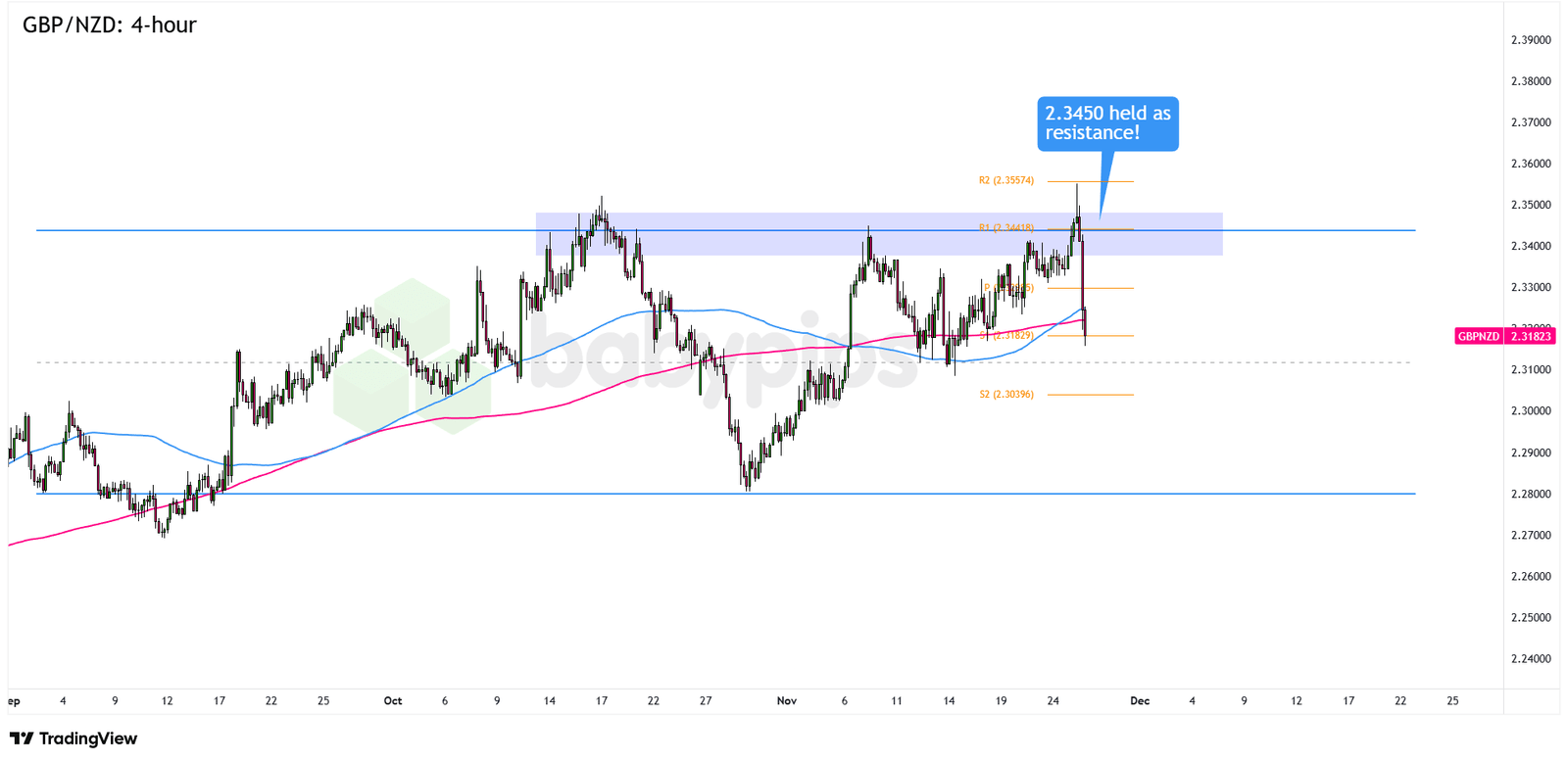 If the candles start showing hesitation and buyers step back in, the downswing could stall mid-range and GBP/NZD may turn higher again, with the 2.3500 area standing out as the first upside target.