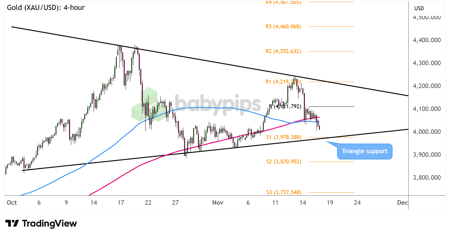 On the other hand, reversal candles around the triangle support could suggest that gold bulls are ready to charge again, possibly taking price back up to the resistance levels at the pivot point ($4,111.79) then the triangle top near R1 ($4,219.22).