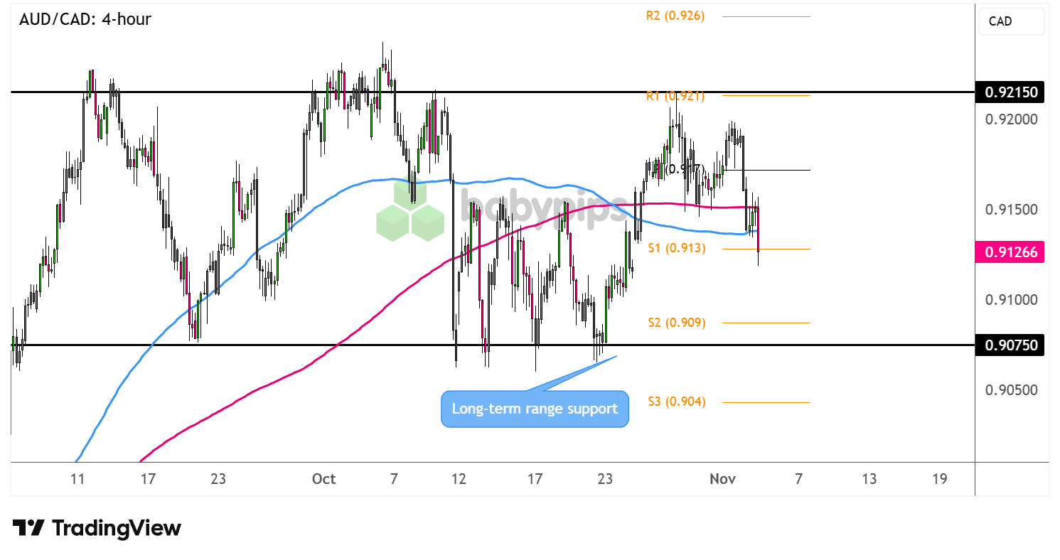 The pair is currently hovering around the area of interest near S1 (.9130) and another bounce could be enough to spur a test of near-term resistance zones at the pivot point (.9170) then the range resistance near R1 (.9210).