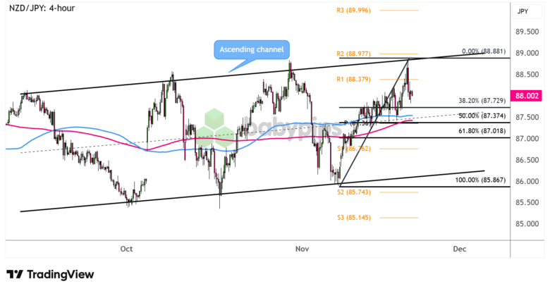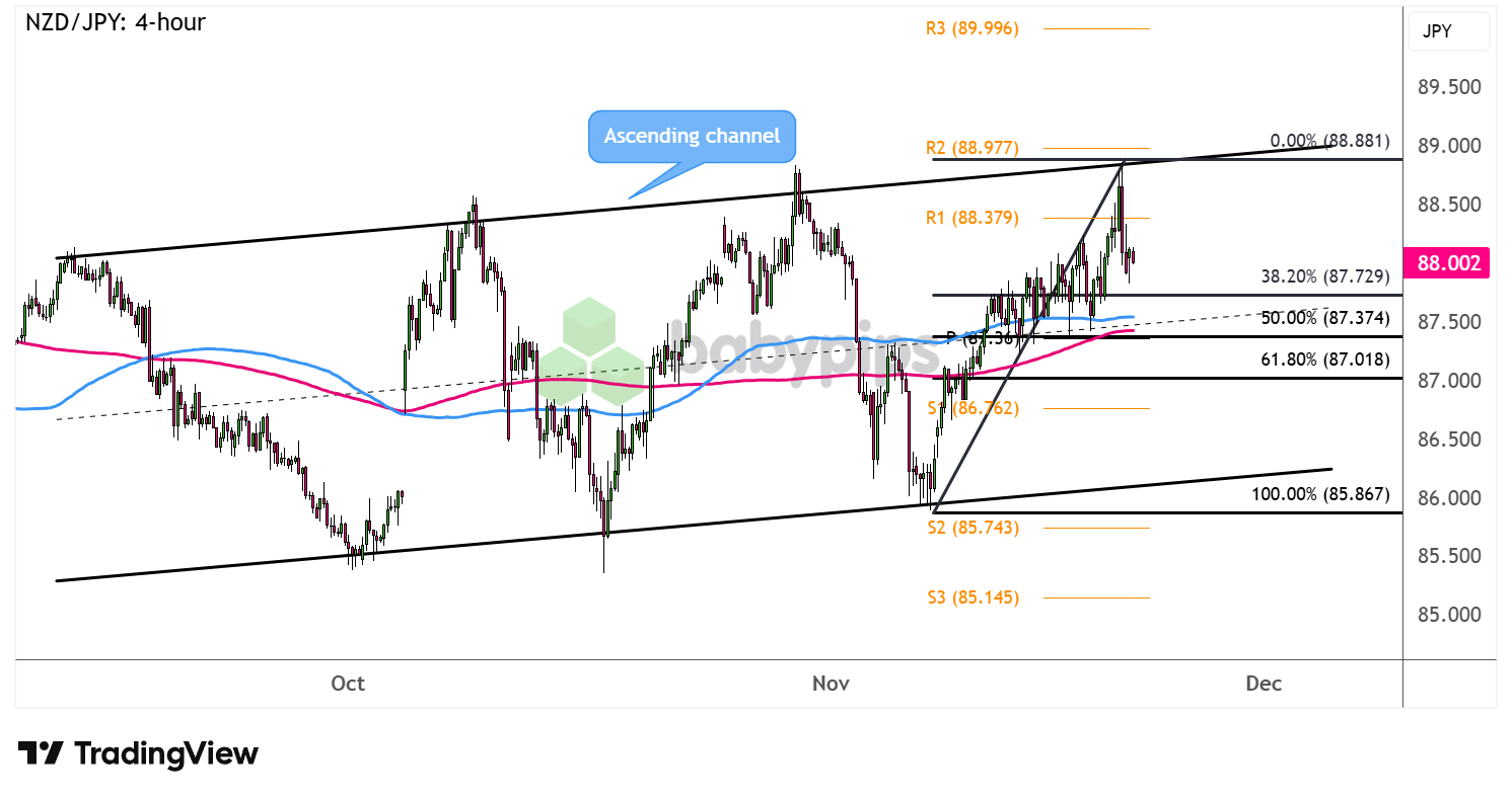 However, NZD/JPY hit a roadblock at the top of its ascending channel as risk assets suffered a sharp reversal on persistent AI valuation concerns.