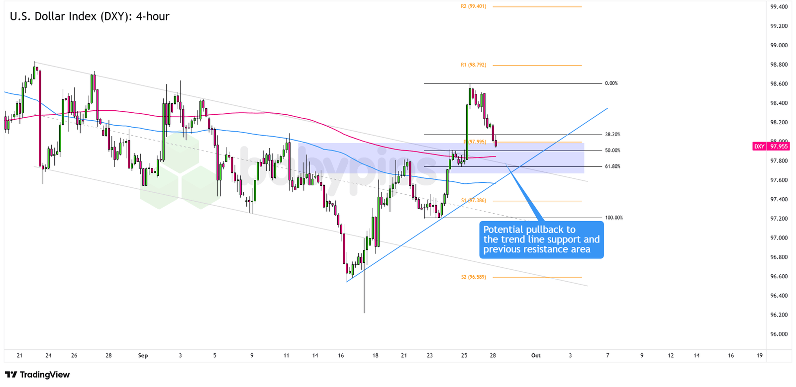 DXY, which has been making higher highs and lows since mid-September, turned lower from 98.60 and is now hovering near the 98.00 psychological level.