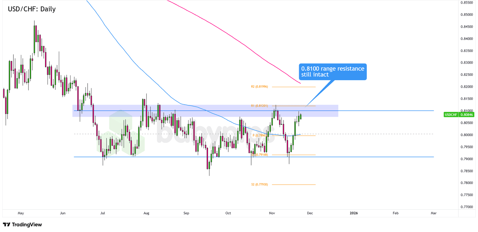 USD/CHF has been stuck in a range pattern since July, but it has enjoyed a strong second half of November. The pair climbed from .7875 and is now knocking on range resistance near .8100.