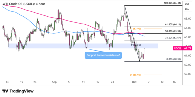 Look out for reversal candlesticks at these areas since a continuation of the slide could take crude oil to the swing low at $60.35 per barrel or to the next bearish target at S1 ($58.92).