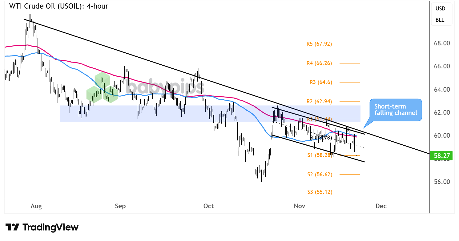 Look out for a possible break below the short-term channel bottom near S1 ($58.28) that could drag the commodity price further south to S2 ($56.62) or to the yearly lows closer to the $56 per barrel mark.