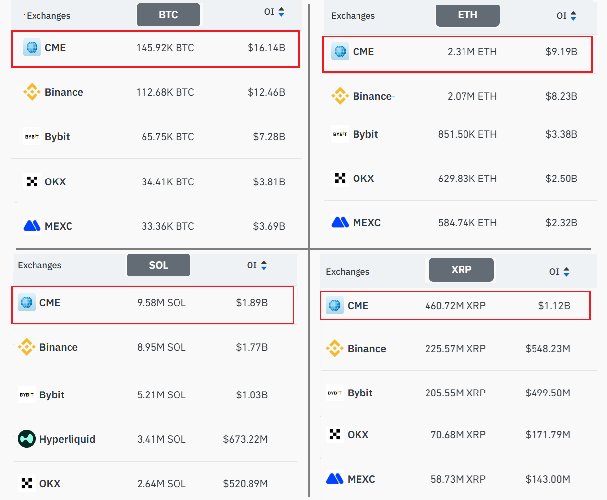 CME’s futures open interest in the top four cryptocurrencies reached $28.3 billion, surpassing Binance’s $23 billion and Bybit’s $12.2 billion.