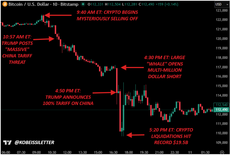 The reason behind the crash can be attributed to a mix of extended market corrections following Bitcoin’s all-time high and rising tensions over new US tariffs on China. According to The Kobeissi Letter, the selloff unfolded through a series of perfectly timed events that tied geopolitical shocks to fragile market sentiment.