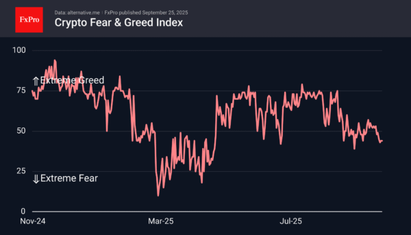 The sentiment index at 44 barely touches the fear zone, preventing us from talking about a full-fledged reversal in sentiment. Nevertheless, we are once again turning our attention to crypto as an early indicator of risk appetite. Altcoins, as well as small currencies of developed countries, have been losing ground since the Fed cut rates a week ago, and key US indices have joined them since Tuesday.