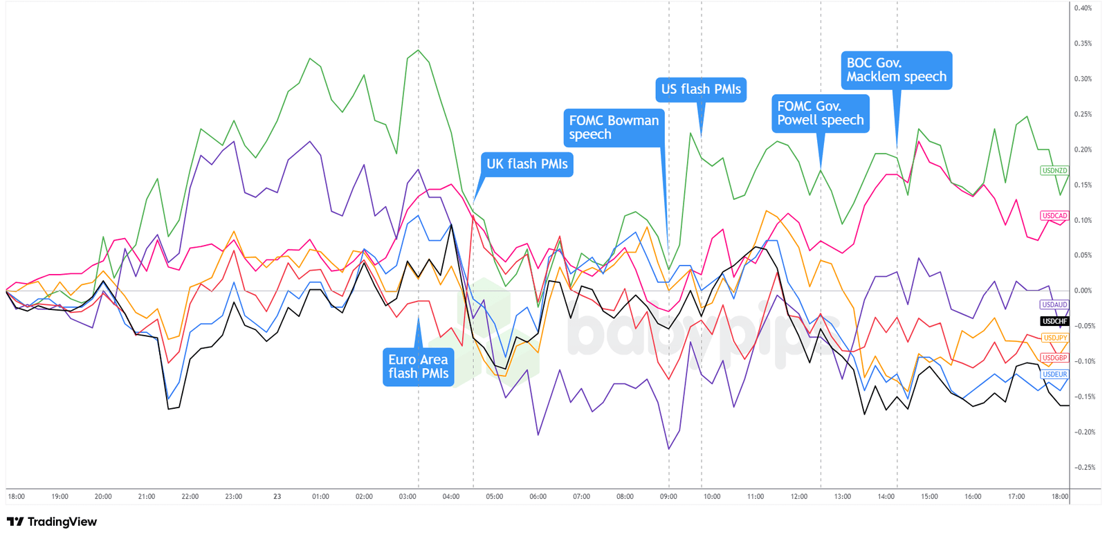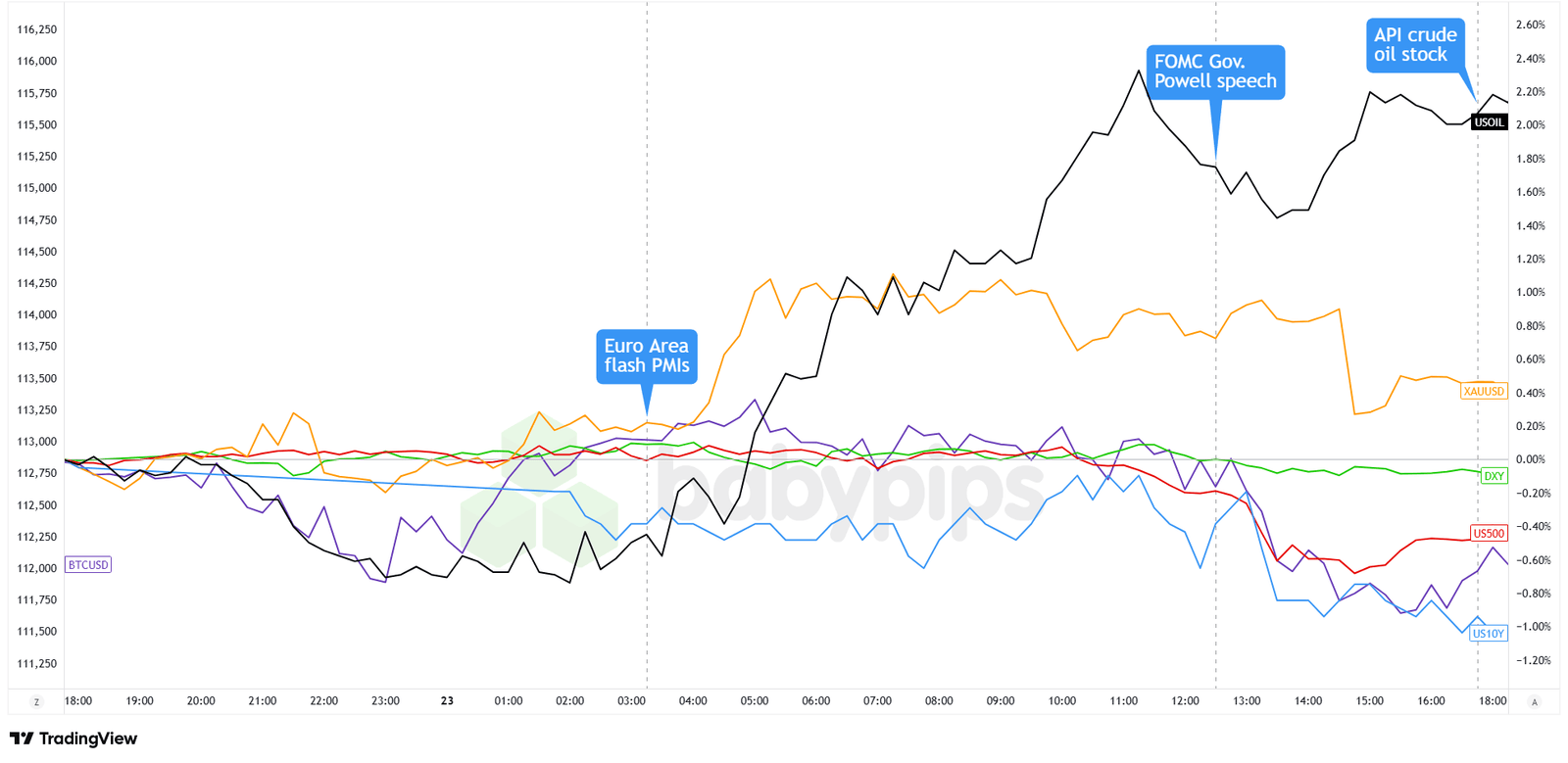The major assets showed cautious positioning ahead of Fed Chair Powell’s speech, with investors parsing mixed signals from various Fed officials throughout the session.