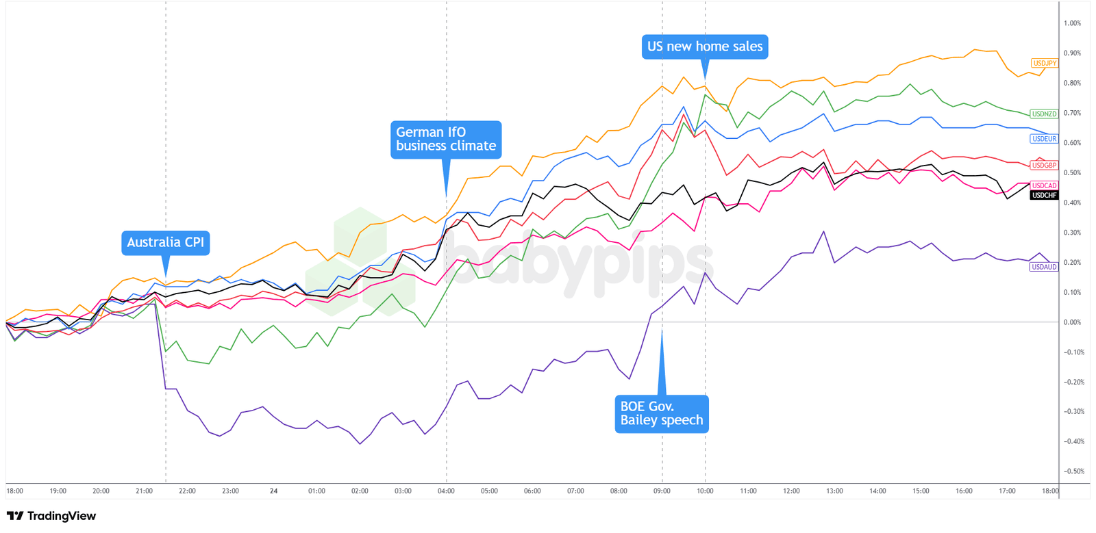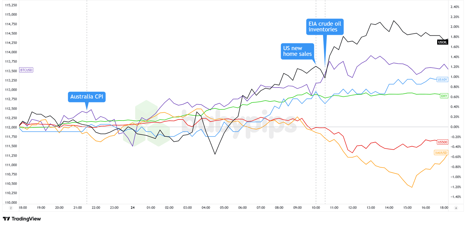 In the U.S., durable goods orders, GDP data, and a lineup of Fed speakers will show whether yesterday’s surprising jump in home sales was enough to justify the hawkish shift in rate expectations. Traders are now pricing in just one Fed cut for 2025, down from two earlier in the week.