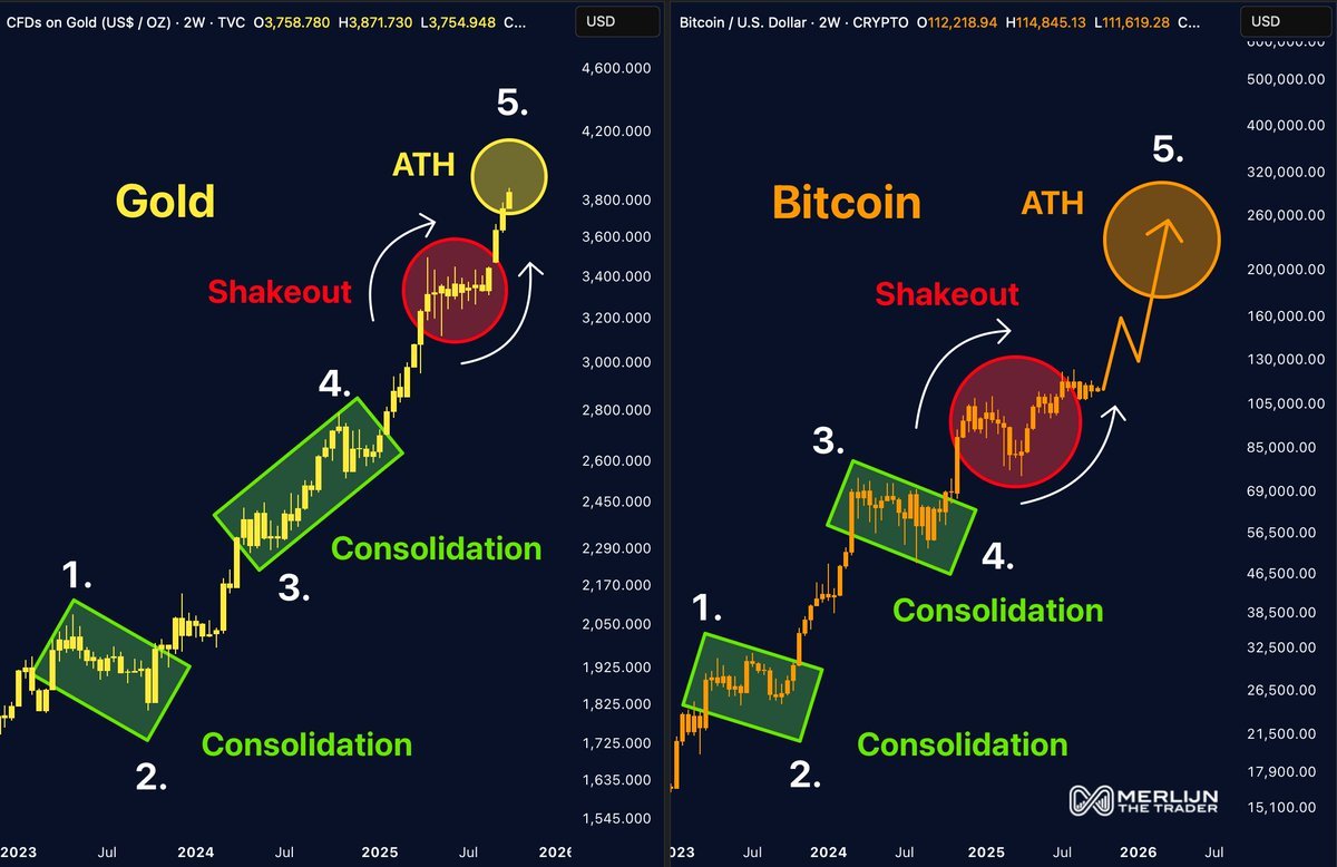 “Gold: shakeout into ATH. Bitcoin: same consolidation, same trap. The breakout is coded. Next stop: price discovery mode,” part of an X post on the day read.