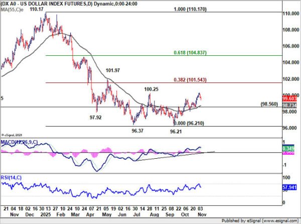 Dollar Index’s rebound from 92.61 continued last week and hit 100.36. Further rise is still in favor in the near term, but upside should be limited by 38.2% retracement of 110.17 to 96.21 at 101.54. On the downside, break of 98.56 support will indicate that the corrective rebound has completed and bring deeper fall back to 96.21 low.
